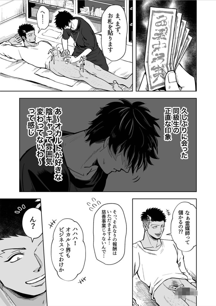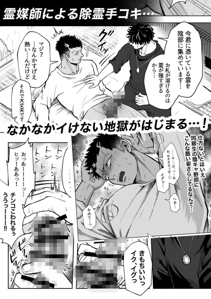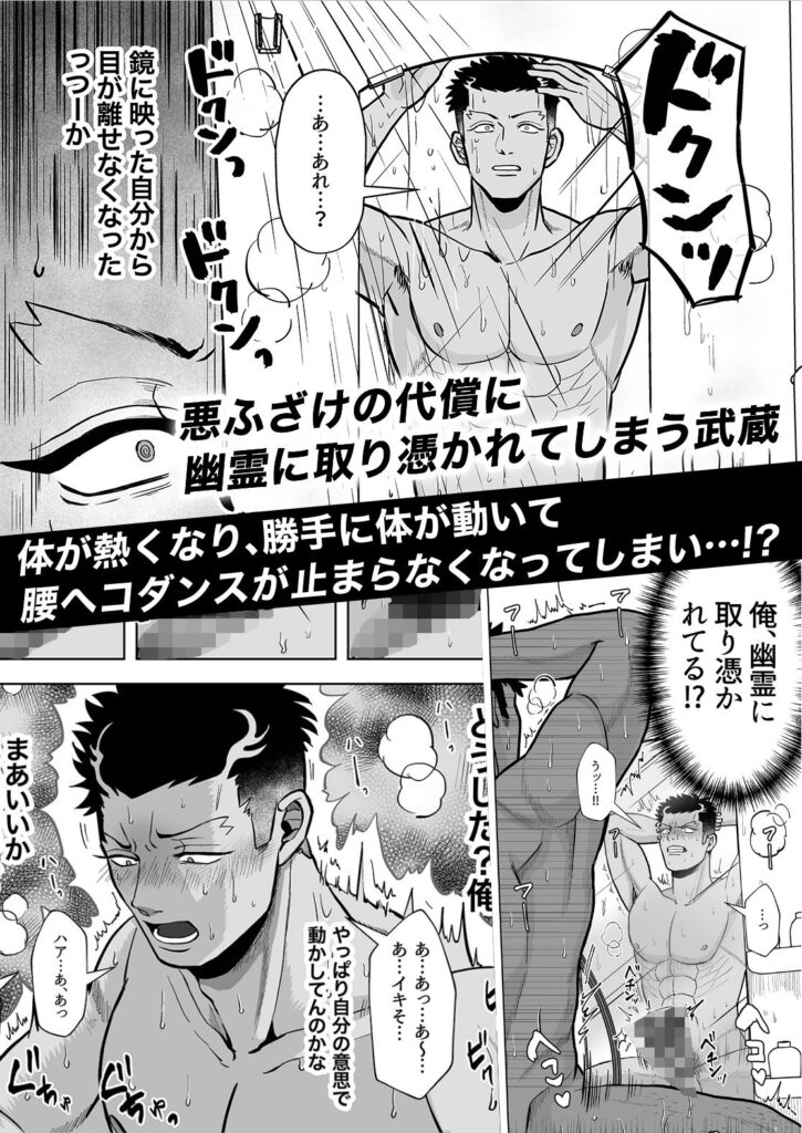 -あらすじ- 主人公、田鹿武蔵はある日友達と共に心霊スポットである廃墟へ出かけた。 奥の鏡の前で下半身を露出した写真を撮り、外で待つ友達に送る度胸試しのようなくだらない遊びをしていたのだ。 しかし家に帰り風呂場の鏡を見た瞬間、武蔵の体に違和感が起こる…!? 確実に霊に体を乗っ取られてしまった武蔵は次の日、元同級生の霊媒師の元へ助けを求めに行く。 下半身にべったりとお札を貼られ、これで終わりかと思った瞬間除霊手コキがはじまる…! 幽霊に体を乗っ取られたバカなノンケチャラ男、武蔵が (1)鏡の前で強●腰ヘコダンスをさせられる話と、 (2)霊媒師に射精できない手コキを無理矢理される話の 二本立てです。 【本文28P/黒ベタ修正】 ※注意※ 過去に外部支援サイトで発表した漫画の再録になります。 重複購入にお気をつけください。