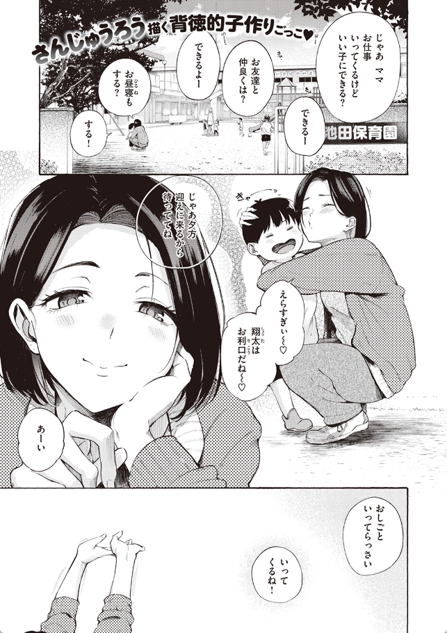 | ヒロインの樹里ママはシングルマザーで、息子を保育園に預けてからバイトしてるのですが、そのバイト先で一緒に働いている大学生・桐谷くんとHな関係になっちゃう話です。 樹里さんは、買い物手伝ってくれた桐谷くんを家の中まで入れちゃった後、迫られた挙句セックスしてしまいますが、この時はまだ背徳感のようなものを感じているらしく、後悔の方が強いといった顔をしています。 つまりまだ母親っていう様子なんですね。ところがその後の桐谷くんの誘いにまた乗ってしまい、そこからズルズルと体を重ねていくところは性欲に流されていて最高にエロいです。 作家さんはセックス中の時の描写アングルが秀逸で、テーブルの下から見た感じや、天井から見下ろした感じのコマが入っていたのは自分が二人のプレイを覗き見しているみたいでゾクゾクさせられました! また、この漫画の見どころは樹里さんがママの顔からメスの顔に徐々に変わっていくところで、ホテルの鏡に映った顔はまさに”めすまま”で本当にエロい!名作なのでシリーズ化熱望します! |