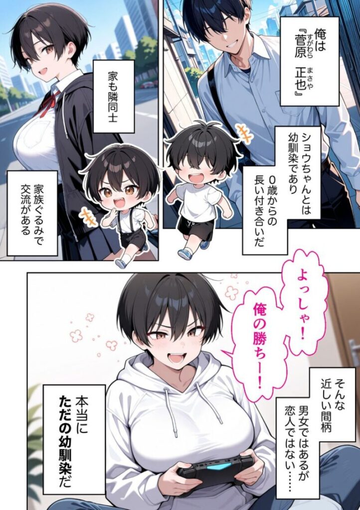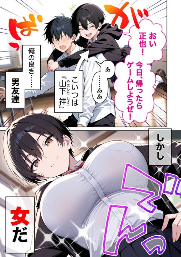 山下祥(しょう)は、小さい頃からずっと「男友達みたいな存在」だった。誰より気が強く、言いたいことはズバッと言う。だが、●校生になった今、主人公の目にはどうしても’女’として映ってしまう瞬間が増えていた。放課後の教室で見せる無防備な笑顔。汗で張りついた髪。そんな些細な仕草に胸がざわつく。それでも「今さら意識してるなんて言えない」と、自分に言い訳を重ねる主人公。だがある日、祥が他の男子に告白されたと聞き、何かが音を立てて崩れた。友情の境界を越える怖さと、それでも手放せない想い。「タダで帰れると思うな」──冗談めかして放ったその言葉が、二人の関係を一瞬で変えていく。【注意事項】※本作品のシチュエーションは全てフィクションです。登場する人物や設定等は、すべて架空のものとなります。※この作品内に登場するキャラクターは全員20歳以上です。※本作品はAIによる生成画像を使用して制作しております。※犯罪、その他違法行為を美化または助長する意図はございません。