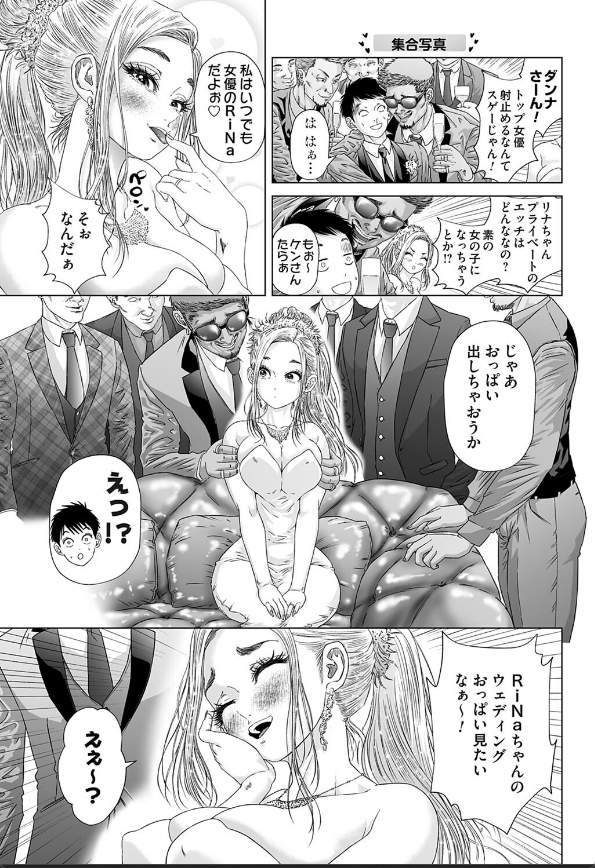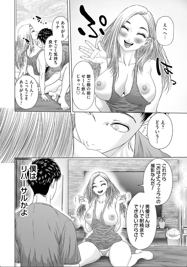 | アイドルから転身後瞬く間に国民的セクシー女優になったRinaと、その夫・和哉のお話ですが、出会いからして完全にギャグです。 撮影のために自宅待機していたら、宅配員としてやってきた和哉を男優と勘違いしてRinaが襲ってしまって、それがきっかけで結婚。 巨根にほれ込んだからと言う理由も理由ですが、結婚パーティーで業界関係者にねだられるままに胸出したりもうやりたい放題です。夫婦関係も、朝のフェラはAV男優は撮影前に本番が出きないから射精させるのがうれしいと撮影に絡めたり、実際のSEXも撮影が絡んでたりとオチが付くのが特徴です。 Rinaが肉食系の美人として描かれているので、ブレーキがぶっ壊れたタイプの女の子に搾り取られるのが好きな人におすすめです。 フェラシーンも後ろからのアングルでパンツのシミやしわ、食い込みを描いたりかなりエロくて実用性高めになります。 露出の激しい服が基本で、ウェディングドレスでもすぐ胸を出したりするくらい、常識が無いのもポイント。 ギャグ系で、国民的なセクシー女優に好かれるなら、女優の方がある程度壊れてるくらいがいいって感じの、都合よすぎるのは秋田と言う人にお勧めしたい作品です。 |
